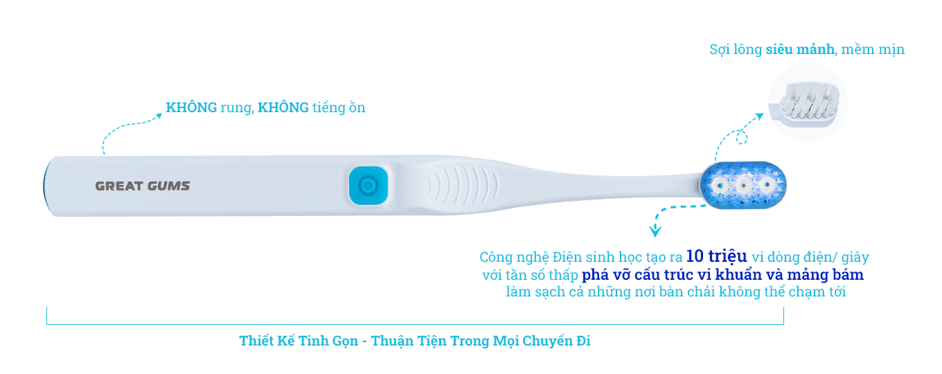 Great Gums là bàn chải cơ – điện sinh học được cấp bằng sáng chế đầu tiên trên thế giới, ứng dụng công nghệ điện sinh học (bioelectric) độc quyền giúp phá vỡ màng sinh học, làm sạch sâu mà không rung, không ồn, không gây ma sát. Được thiết kế chuyên biệt cho nướu nhạy cảm, sản phẩm mang lại trải nghiệm chăm sóc răng miệng êm ái, an toàn và hiệu quả đã được chứng minh lâm sàng. Đây là lựa chọn hoàn hảo cho nụ cười khỏe mạnh và hơi thở tự tin.
